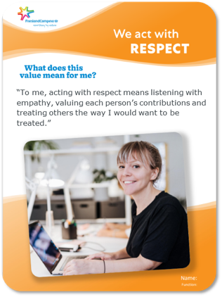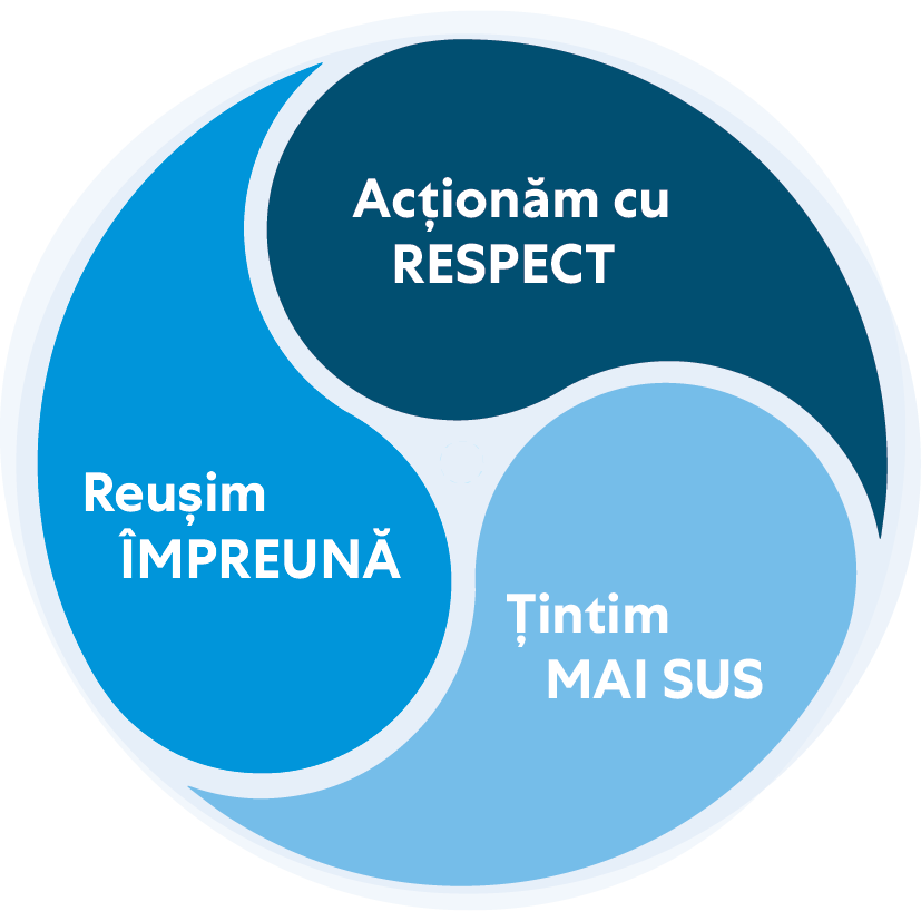 Acționăm cu respect pentru oameni și planetă. Apreciem opiniile diferite, deoarece ele ne provoacă modul de a gândi și ne fac mai buni. Suntem curioși, ascultăm cu atenție și comunicăm în mod direct, clar și cu încredere.